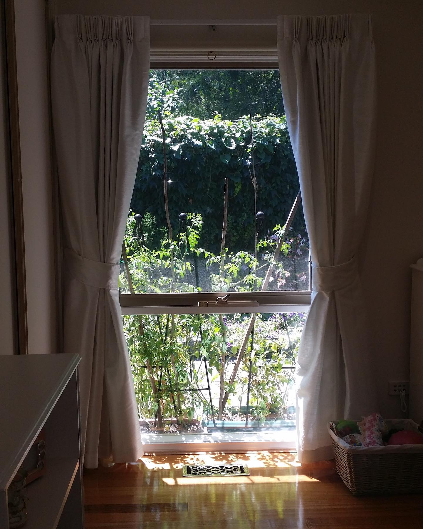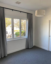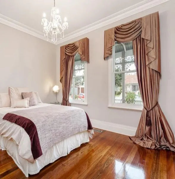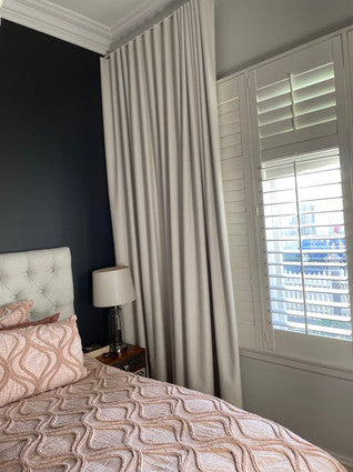 Sfold Drapesfitted ceiling to floor, wall to wall for extra insulation over the Plantation Shutters in this front east facing bedroom.