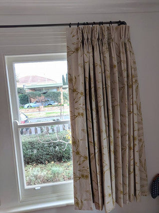 Triple Pinch Pleat Curtainsin Ink and Spindle Hakea. Screen printed Oz flora and fauna fabric. on a bespoke rod.