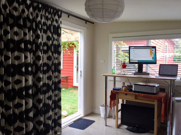 Triple Pinch Pleated drapewith rings on a black stainless steel rod. Adding warmth and privacy to this backyard office.