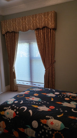 Drapes behind a shaped padded Pelmetwith sheer roller blind behind for privacy.